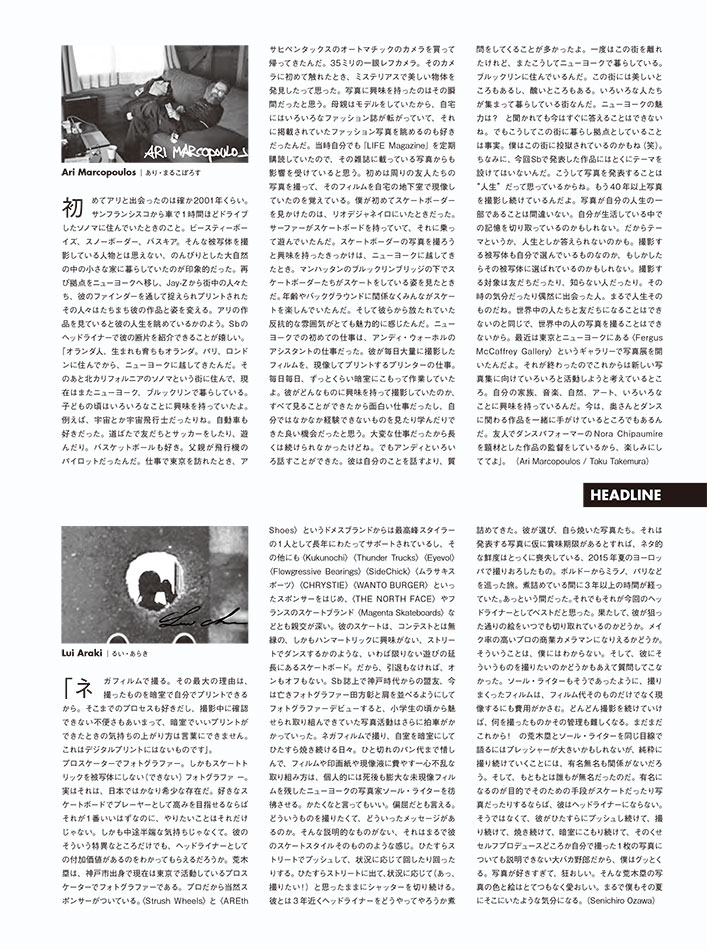 HEADLINERの第9弾はニューヨークの写真家アリ・マルコポロスとプロスケーターでいつもカメラを肩にかけてプッシュしているフォトグラファーの荒木塁。フィルム写真に魅せられた2人の対比がかなり良い。東京オリンピック前夜、それまでスケートをマイナーのスポーツ?と言ってた大手広告代理店やナショナルクライアントがもろ手を上げてワッショイしている今。合わせて、日本のスケートスキルもすごいことになってて、それはそれは素晴らしいかぎり。スケート人口もガンガン。シーンは季節で言うなら、最高の真夏になっている。そんなときに、スケートグラビアなんていうのがなかった時代から、散々スケートのカッコイイを真摯にドーンと記録してきたはずのWHEELマガジンやSbが、もしかしたら時代のあだ花?、もしかしたらお疲れさん?な立ち位置になっているのは、とてもおもしろい。どうしてどうしてブレずに懲りずに、スケートやスケーターを撮る、記録する、そのたぐいまれな写真たちをヘッドラインすること。これはやりがいがある。くしくも、かなりつっこみが入りそうな、スケートのライディング写真が見当たらないイシューに今回はなってて、スケートやストリートのニオイはプンプンしているのだけど、どうした?っていうくらいの香しいページ構成。超良い感じ。アリ・マルコポロスと荒木塁。この対比。いつかは「こんな2人によるこんなイシューもあったの?!」なんていうことになる1冊かと思ってる。あなたの本棚にもぜひ! それから、2人がそれぞれに今後リリースするであろう写真集を追いかけてみて。そこには必ず、スケートボードの光と影が収まってるはずだから! Sbは書店、プロショップにてご購入できます。書店発売は5月31日より。